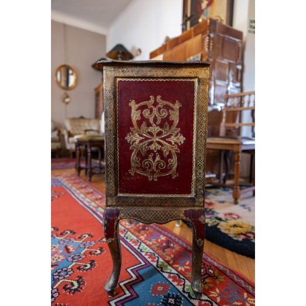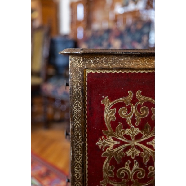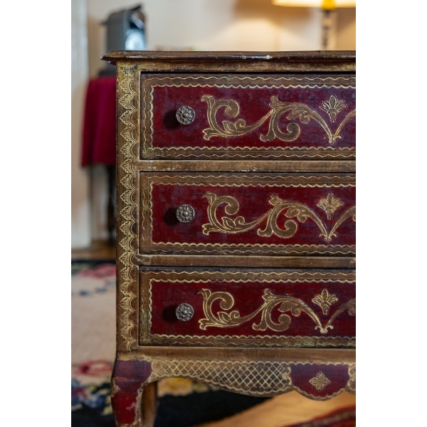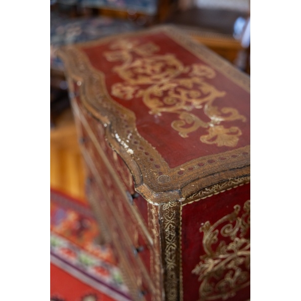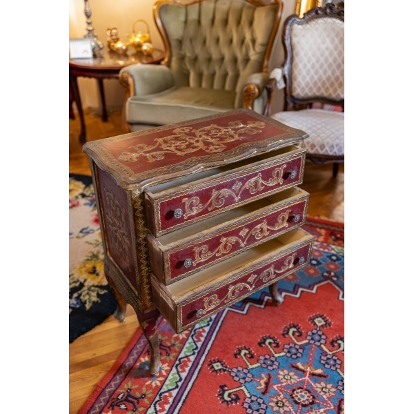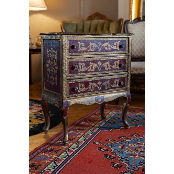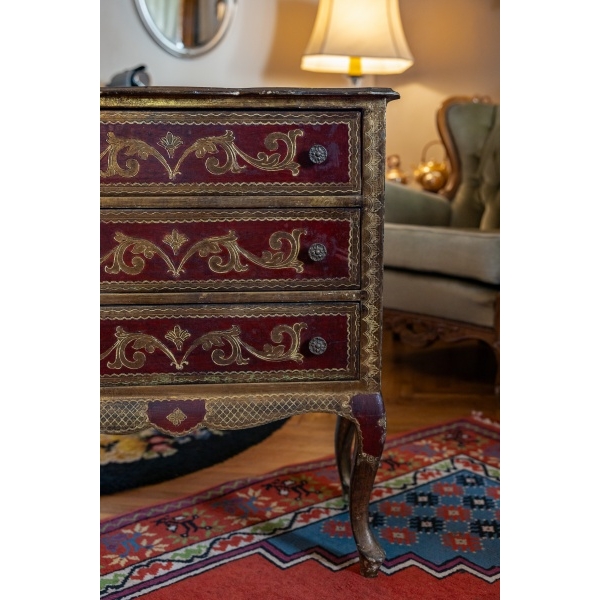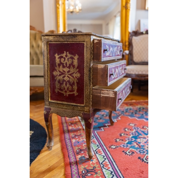 Comodă cu trei sertare, realizată în Italia, anul 1960, din lemn de stejar, în stil florentin. Piesa de mobilier este pictată manual, cu elemente clasice în stil baroc, cu foiță de aur prezentând ușoare urme de amprenta timpului.