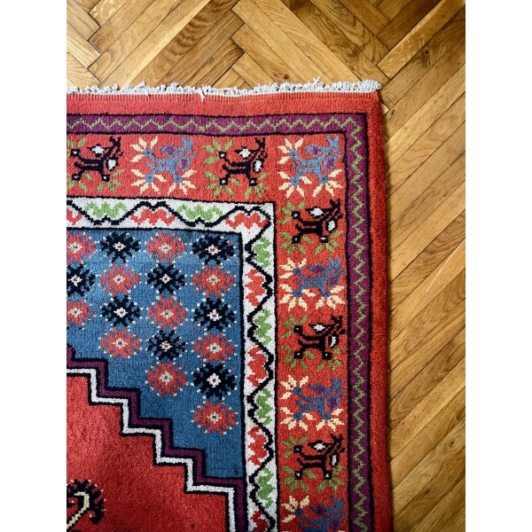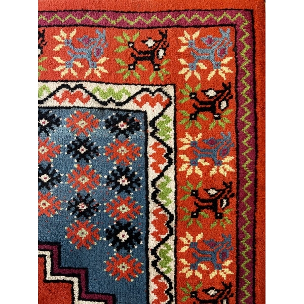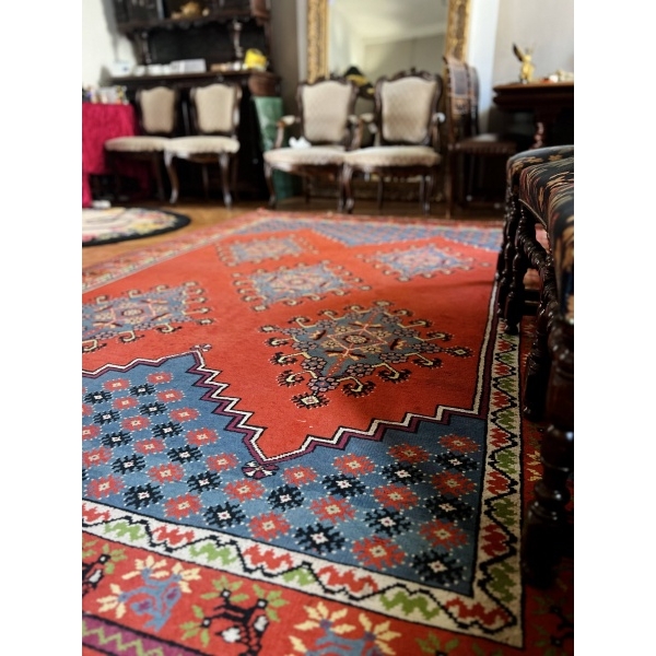 Covor Caucazian țesut manual în perioada anilor 1960 - 1970. Covorul este din lână pe urzeală din bumbac, cu flori și elemente decorative poziționate în romburi cu culori vii.